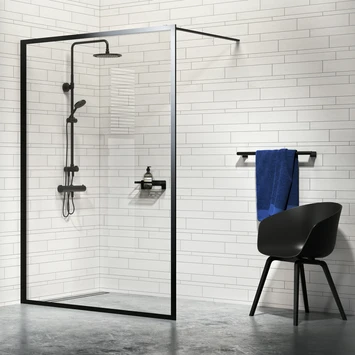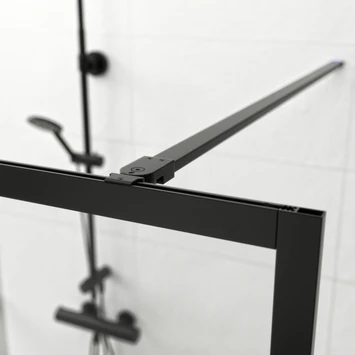 De inloopdouche A3 Contour Zwart 88x200cm heeft een minimalistisch kader wat afgewerkt is in matzwart. De douchewand heeft 6mm dik veiligheidsglas en is voorzien van een antikalk laag. Dankzij deze laag blijft het glas nog langer mooi helder. De inloopdouche wordt geplaatst met een stabilisatiesteun van 1 meter. De steun is tot de gewenste lengte in te korten en ook in een hoek te monteren. Hierdoor past de Inloopdouche A3 Contour Zwart 88x200cm in bijna iedere badkamer.